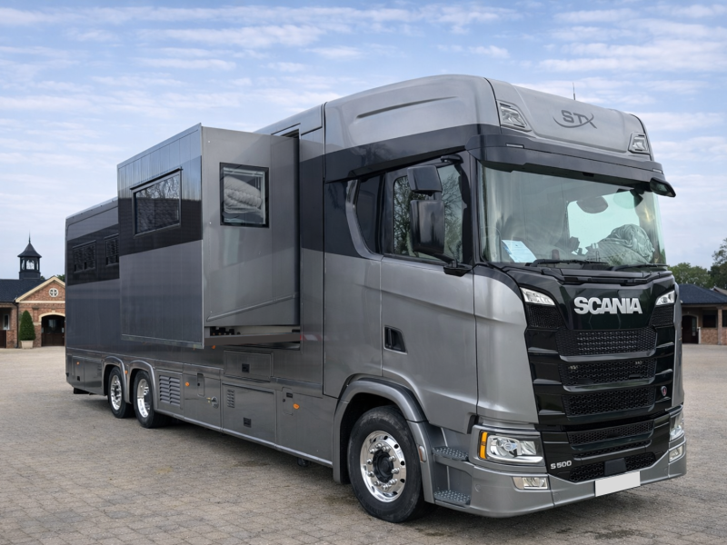 2024/74 Scania S500, based on the all new 205 model Scania cab. Our own STX-UK demo, with a monster spec, including double living pop outs, big pop up, underfloor heating, tack locker & lift, PlayStation 5, 43″ smart TV, full aircon system for living area, skylights to living and pop-up, huge bathroom, as well as sleeping for eight, and stalled for six.